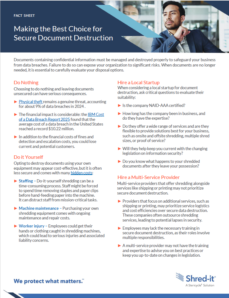 Shred-it® is committed to providing secure and efficient destruction services for confidential information. With a focus on protecting sensitive data, Shred-it® utilizes proven processes to ensure that your organization’s documents are disposed of in compliance with relevant regulations.